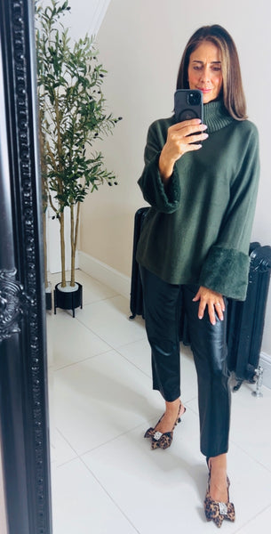 Soft and cosy flat knit jumper, loose slouchy fit with cowl style neckline and soft faux fur trim to sleeves