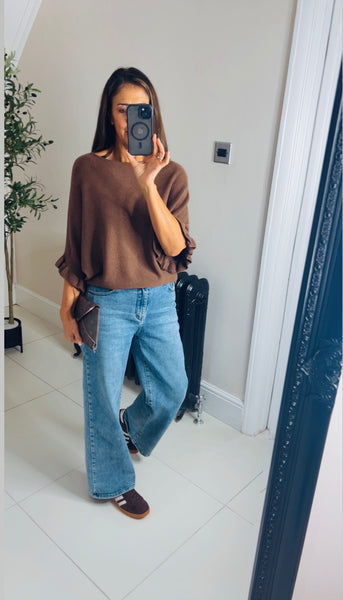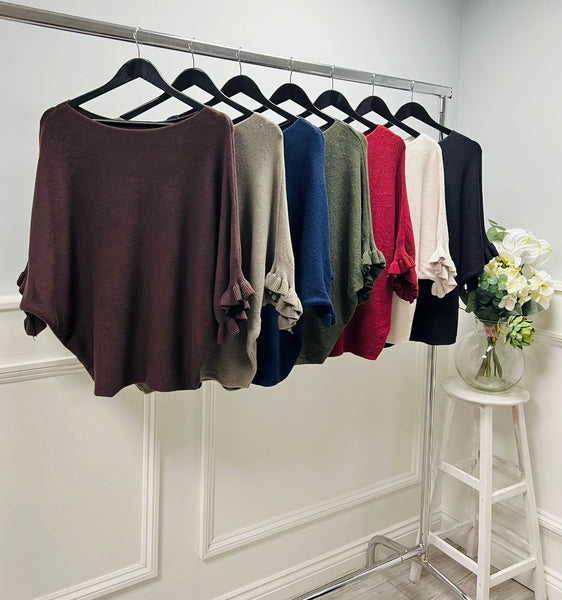 Super soft batwing style knit with gorgeous ruffle detail to sleeves, soft wide neck that can be styled off the shoulder one size to 16