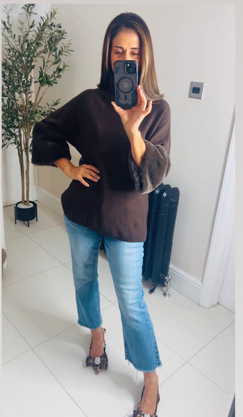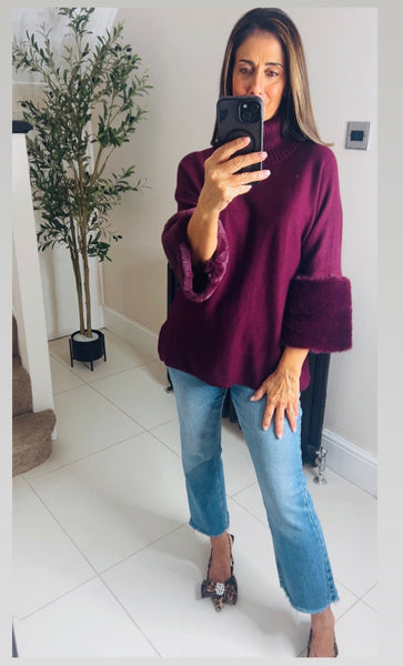 Soft and cosy flat knit jumper, loose slouchy fit with cowl style neckline and soft faux fur trim to sleeves