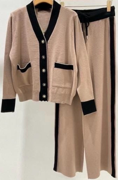 soft lux feel flat knit coord set. Beautiful black v neck cardigan with cream trim and gold button detail & drawstring trousers black with cream side stripe