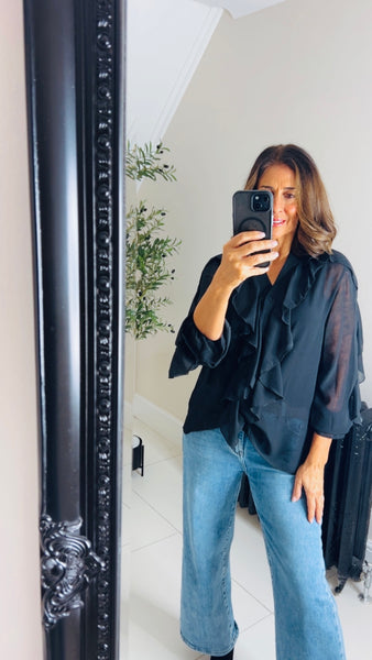 Fabulous slightly sheer ruffle shirt , button through with ruffle to front & sleeve.