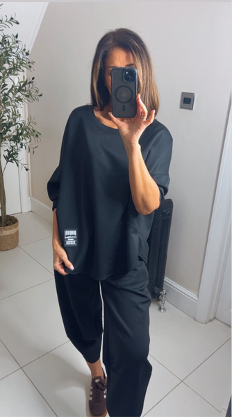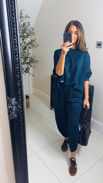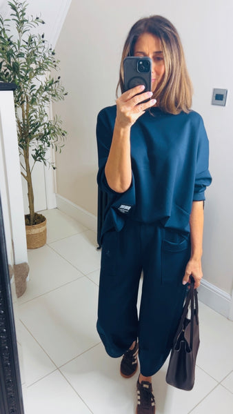 Soft scuba fabric barrel style loose leg bottoms with elasticated waist and front pockets