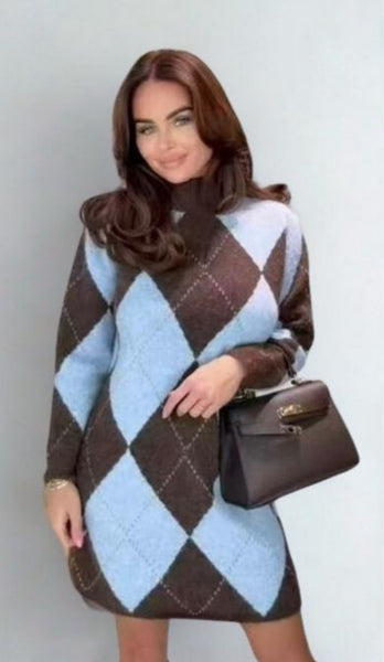 Beautiful colour way baby blue and chocolate printed jumper dress. Cosy and warm, perfect length with leggings or tights. One size to 16