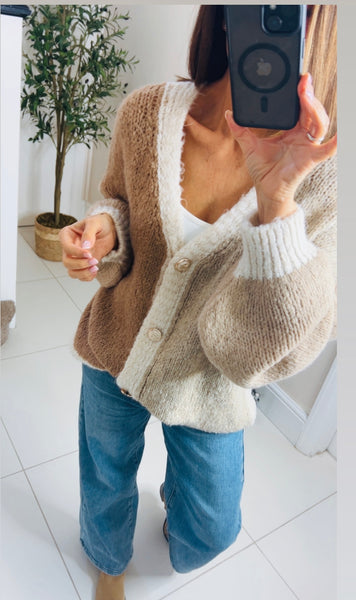 Loose slouchy oversize fit in a beautiful neutral colourway of taupe, beige and cream. Gold button detail one size to 18