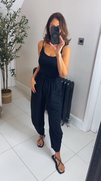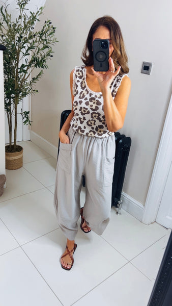 A spring summer wardrobe essentials the perfect pop on and go trousers, lightweight and flattering Barrell style shape and ankle Frazer length. Elasticated waist and front pockets. One size to 14/16 viscose mix